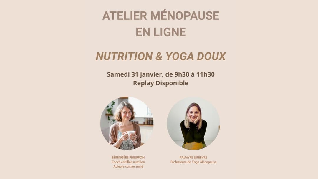 Atelier Ménopause : Nutrition & Yoga Doux Cet atelier a été conçu pour accompagner les femmes en (pré)ménopause avec des outils concrets, accessibles et applicables au quotidien. La première partie de l’atelier est animée par Bérengère Philippon, référence de l’alimentation à IG bas. Elle partagera des conseils pratiques pour optimiser son assiette, comprendre les grandes règles de l'alimentation, la prise de poids, etc. La seconde partie est consacrée à une séance de yoga doux, que je guiderai, axée sur le relâchement des tensions, la respiration et la régulation du stress, un facteur clef dans de nombreux déséquilibres hormonaux. La pratique est lente, apaisante et pensée pour calmer le système nerveux. ✨ Accessible à toutes ✨ Aucun niveau requis ✨ Débutantes bienvenues Informations pratiques : - Durée : 2h - Format : atelier en ligne, en direct - Replay : disponible - Matériel conseillé : tapis, plaid, coussins et tenue confortable. Si vous pratiquez déjà le yoga, vous pouvez également prévoir des briques ou un bolster. La pratique étant douce, il est recommandé de bien se couvrir pour rester au chaud. Un atelier pour mieux comprendre son corps, relâcher la pression et repartir avec des clés simples pour traverser cette période avec plus de sérénité !